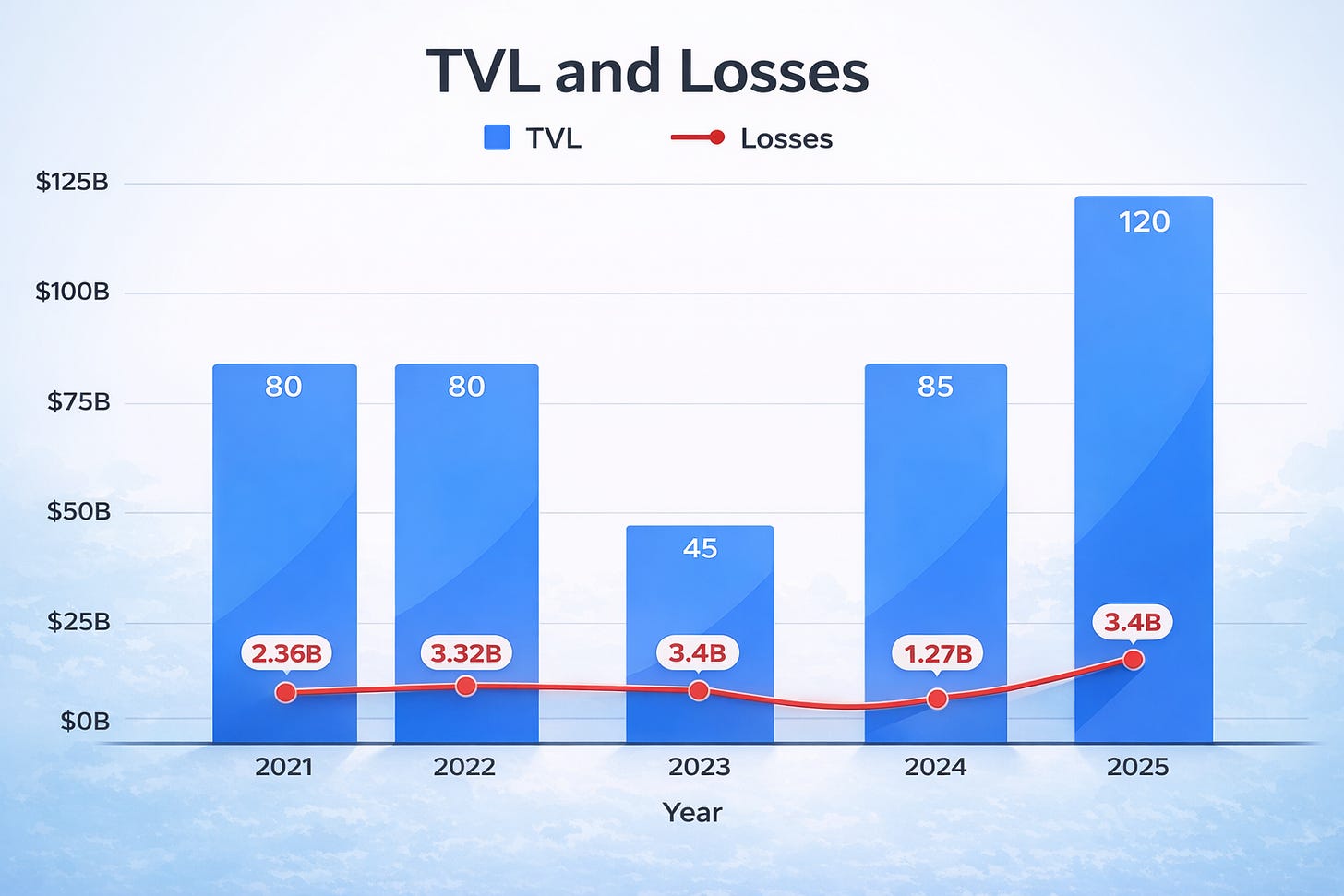 2025 saw losses climb back to $3.4B, pushing the loss rate to 2.8%. But that number is heavily skewed by personal wallet compromises and exchange wallet hacks, just one of which accounted for $1.5B.